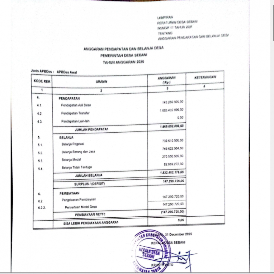 Anggaran Pendapatan dan Belanja Desa (APBDes) Sebani Tahun 2026 disusun sebagai pedoman utama dalam pelaksanaan kegiatan penyelenggaraan pemerintahan, pembangunan, pembinaan masyarakat, pemberdayaan masyarakat, serta penanggulangan keadaan darurat dan mendesak desa selama 1 (satu) tahun ke depan. Proses penyusunan ini dilakukan secara partisipatif dengan melibatkan Badan Permusyawaratan Desa (BPD), Perangkat Desa, Lembaga Kemasyarakatan, serta Tokoh Masyarakat. Hal ini bertujuan agar anggaran yang ditetapkan benar – benar mencerminkan aspirasi dan kepentingan masyarakat Desa Sebani, Kecamatan Tarik, Kabupaten Sidoarjo.